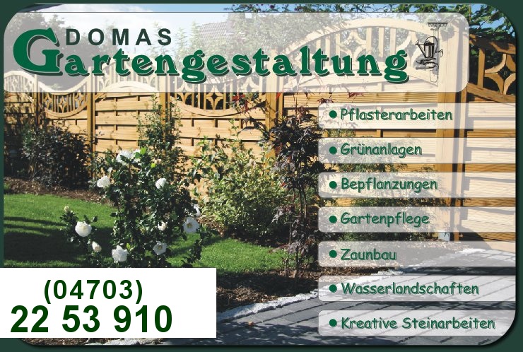 Inh. H.-Peter Domas | Pennhop 4 | 27619 Schiffdorf-Sellstedt Telefon (04703) 22 53 910 | Fax (04703 22 53 911 | Mobil (0171) 16 54 273 E-Mail: mail@domas-gartengestaltung.de